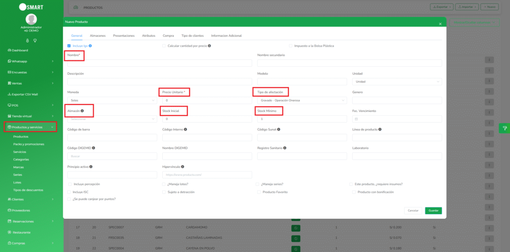 - Completa la información requerida, incluyendo el nombre del producto, precio, almacén, stock inicial y stock mínimo.