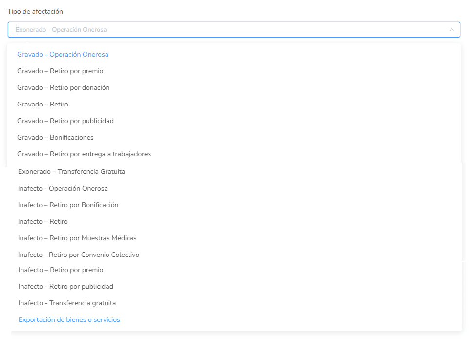 - En el apartado de TIPO DE AFECTACIÓN, selecciona la opción que corresponda para determinar si el producto está sujeto al IGV.